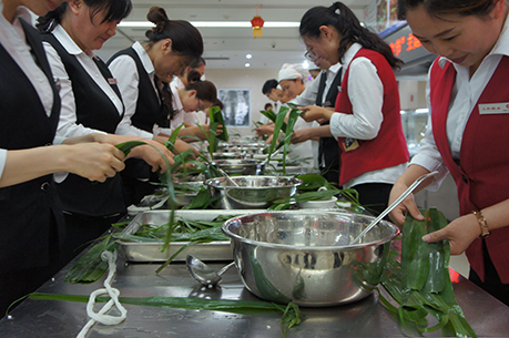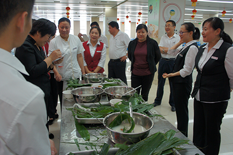 公司接到市文明辦通知后,從領(lǐng)導(dǎo)層到普通員工都比較重視,紛紛感到中國(guó)的傳統(tǒng)民俗節(jié)日有著自己獨(dú)特的文化內(nèi)涵,是弘揚(yáng)中華民族精神的重要文化載體,是培養(yǎng)愛(ài)國(guó)主義與集體精神的有機(jī)結(jié)合。大家自發(fā)上網(wǎng)學(xué)習(xí)端午節(jié)來(lái)歷,了解傳統(tǒng)節(jié)日的民間習(xí)俗,緬懷詩(shī)人屈原的愛(ài)國(guó)情懷,經(jīng)征求意見(jiàn),決定組織包粽子比賽。本次活動(dòng)由各部門(mén)推薦1至2人參加,限時(shí)5分鐘,數(shù)量多質(zhì)量佳取勝。餐飲部將事先準(zhǔn)備好的食材一一擺在桌子上,參賽的18名同志分站成兩組,隨著開(kāi)始的一聲令下,18名同志迅速按照拿、裝、按、包、纏等步驟,將一個(gè)個(gè)飽滿、可愛(ài)、綠都都的粽子擺在了桌子上。時(shí)間緊張、動(dòng)作迅速,現(xiàn)場(chǎng)氣氛相當(dāng)凝重,圍觀者不敢發(fā)聲,怕影響到參賽者的成績(jī),拍照的同志從不同角度抓拍,認(rèn)真記錄每一個(gè)精彩瞬間。第一輪比賽結(jié)束,評(píng)委上前查看,竟然出現(xiàn)了2個(gè)并列第一的成績(jī),在現(xiàn)場(chǎng)指導(dǎo)的公司張經(jīng)理當(dāng)即決定二人再比一次。但令大家沒(méi)有想到的是再次出現(xiàn)平局,經(jīng)過(guò)評(píng)委綜合評(píng)議,餐飲四部彭善美以質(zhì)量過(guò)硬、外形漂亮的細(xì)微差異獲得本次冠軍。活動(dòng)最后,獲得前三名的8名同志合影留念,為此次活動(dòng)畫(huà)上圓滿句號(hào),參賽隊(duì)員都是笑著離開(kāi)了活動(dòng)現(xiàn)場(chǎng)。